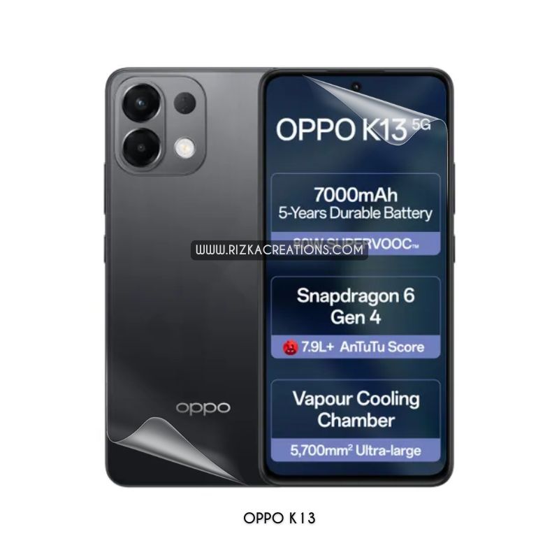 Sim and durable Hydrogel Protectors for OPPO K13 with 0.21mm screen and 0.16mm back thickness. Features shock absorption, self-healing, high touch sensitivity, and fingerprint unlock support. Available in clear and matte finishes. Worldwide delivery from rizkaCreations.com.
