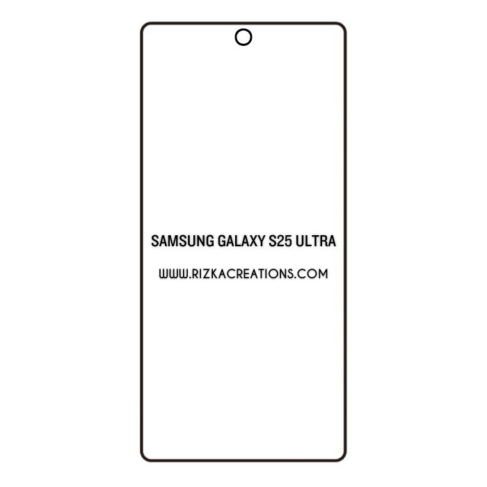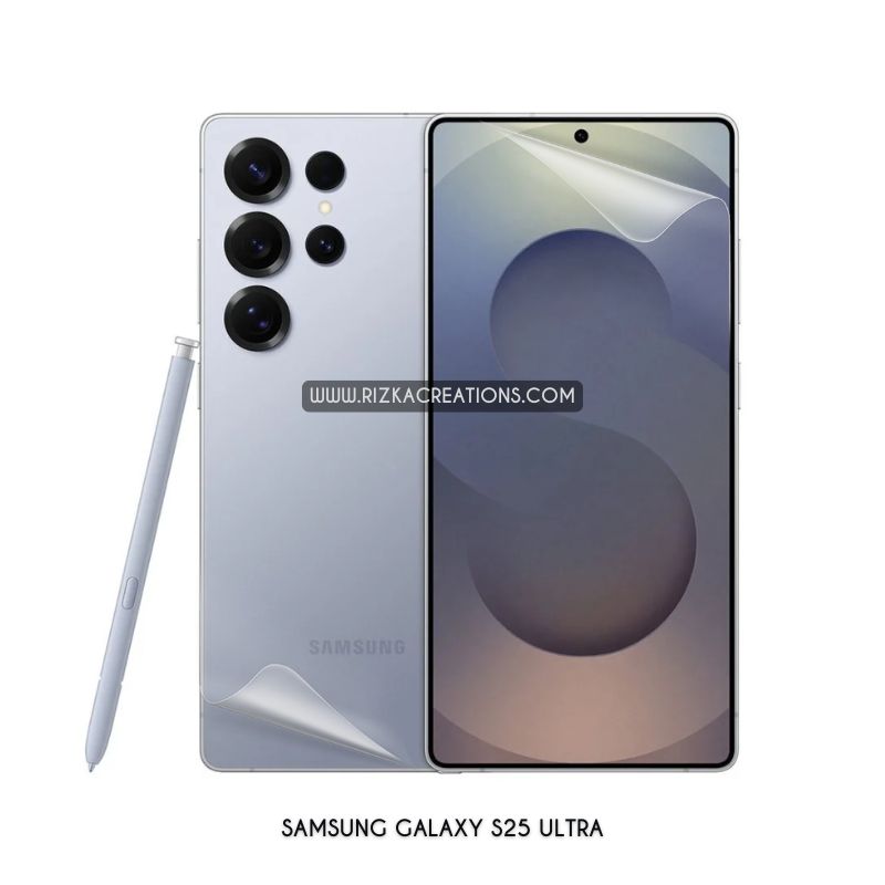 Premium Hydrogel screen and back protectors for Samsung Galaxy S25 Ultra. Ultra-thin (0.21mm/0.16mm), self-healing, shock-absorbing, and fingerprint-unlock friendly. Available in matte or clear. Full edge-to-edge protection with worldwide delivery via rizkaCreations.com.